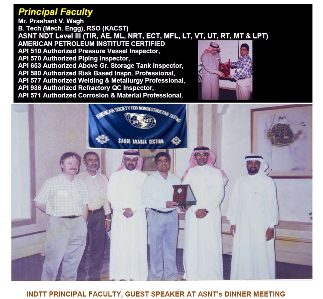 Our Faculty is also API (American Petroleum Institute) Certified Authorized Pressure Vessels inspector API 510, Authorized Piping inspector API 570, Authorized Storage Tank inspector API 653, Authorized Risk Based Inspection Professional API 580, Authorized advanced Welding & Metallurgy professional API 577, Authorized Advanced corrosion & material Inspector API 571 & Authorized Refractory Quality control personnel API 936)