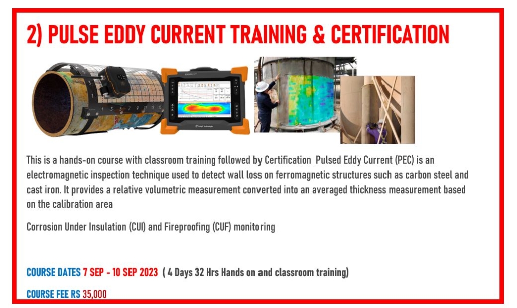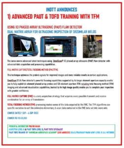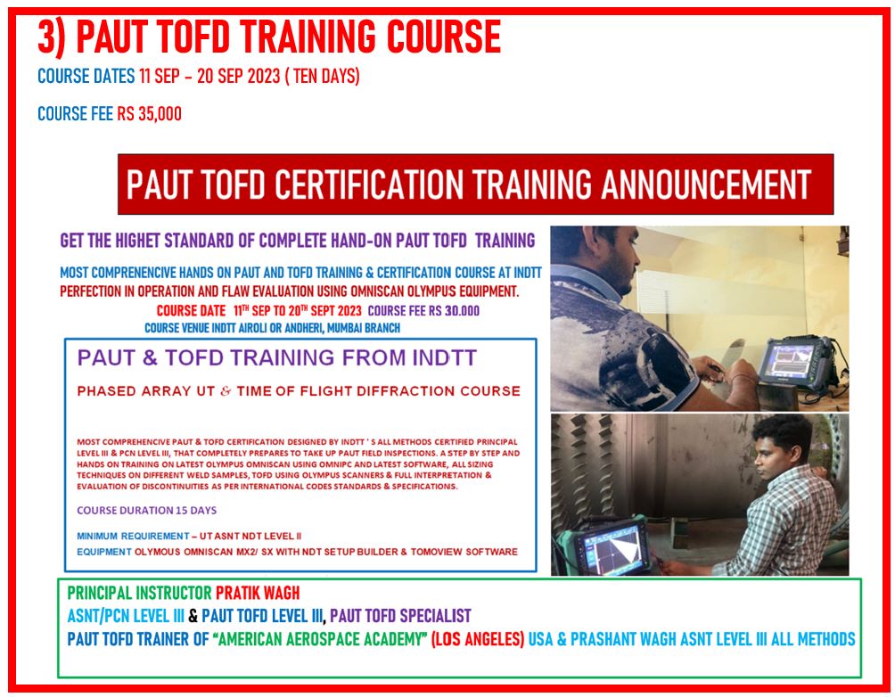 Our advanced NDT faculties are experienced in US and have been training in US aviation personnel who are advanced NDT specialists and offer most comprehensive programs in Ultrasonic Phased Array PAUT including latest TFM technique , Time of Flight Diffraction TOFD, ACFM, Guided Waves Ultrasonics, IRIS, Magnetic Flux Leakage ( Piping & tanks), Helium Mass Spectrometer other Leak methods, Multi Frequency Eddy current Inspection, Acoustic Emission Inspection, Industrial Infra-red Thermography inspection, Video borescope & Neutron radiography.
